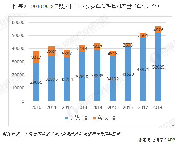 根据中国通用机械工业协会风机分会统计,2017年,协会会员单位罗茨鼓风机产量为48371台,同比增长16.5%;协会会员单位离心鼓风机产量为3664台,同比增长35.8%。据测算,2018年,协会会员单位鼓风机产量合计达到5.7万台,同比增长9.54%。
