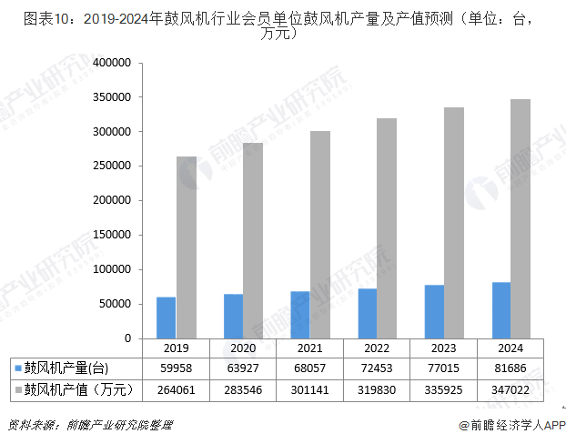 未来,国内分布式能源、垃圾发电、污水处理、大气污染治理行业的持续推进,将进一步刺激鼓风机行业的需求。同时竞争态势看,国内鼓风机企业与国外优秀鼓风机品牌在技术上的差距在逐渐缩小,未来国内鼓风机企业将进一步占据国内鼓风机市场份额。基于以上两点考量,前瞻认为,鼓风机市场仍有较大的发展空间,预计到2024年,会员单位鼓风机产量将突破8万台,会员单位鼓风机产值将突破34亿元。